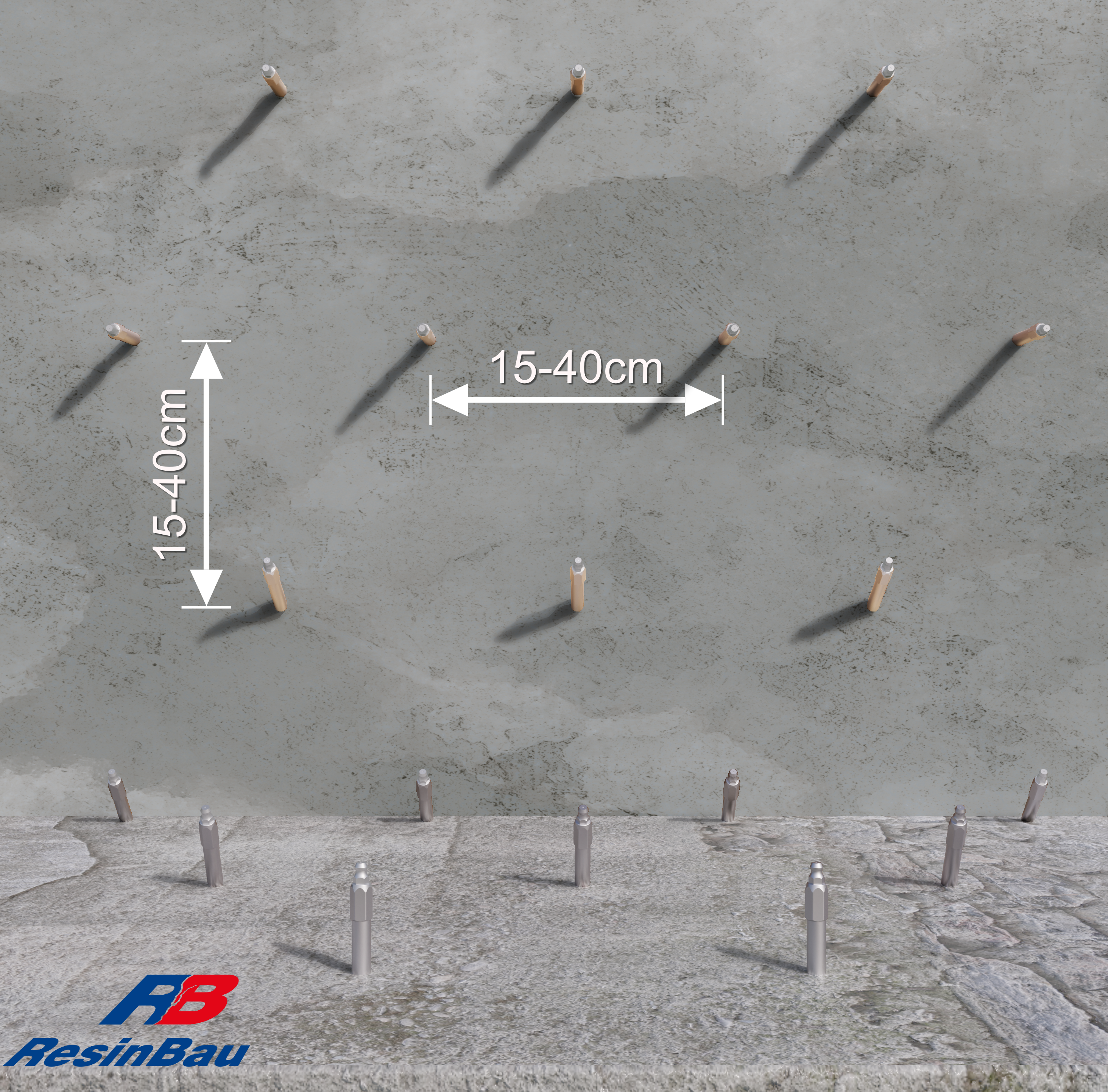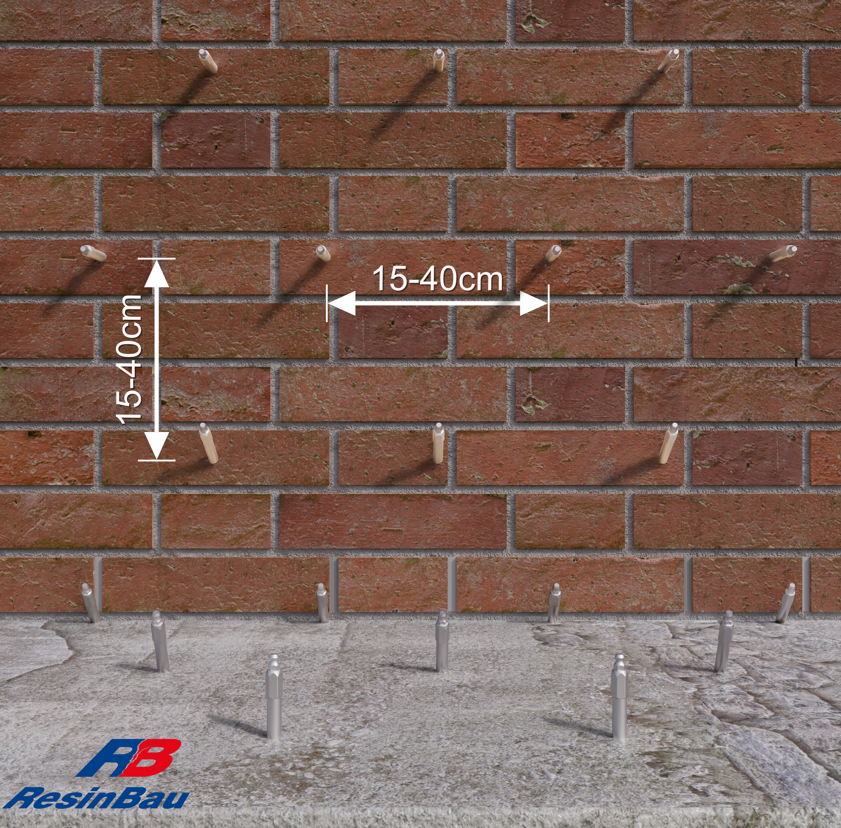 Schematy rozmieszczenia i ułożenia otworów iniekcyjnych dla iniekcji strukturalnej. W przypadku cegły zaleca się wiercenie w cegłach pełnych, nie w spoinach, aby zapewnić równomierne nasycenie i skuteczne uszczelnienie konstrukcji.