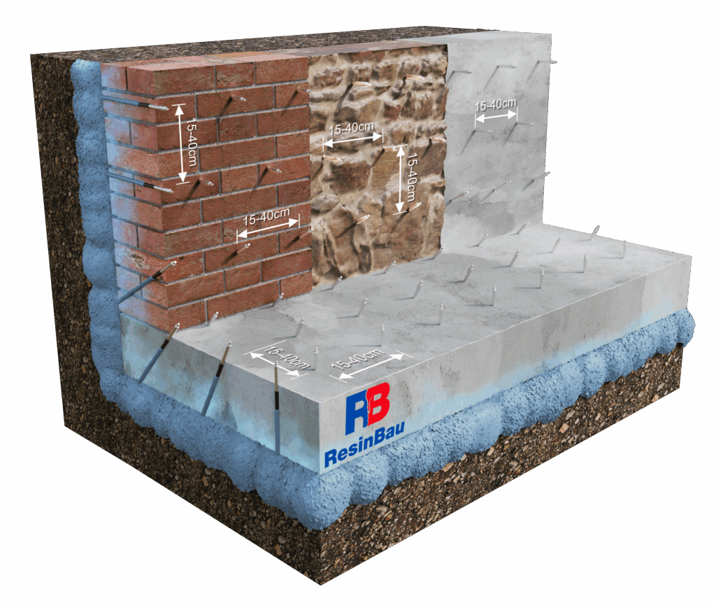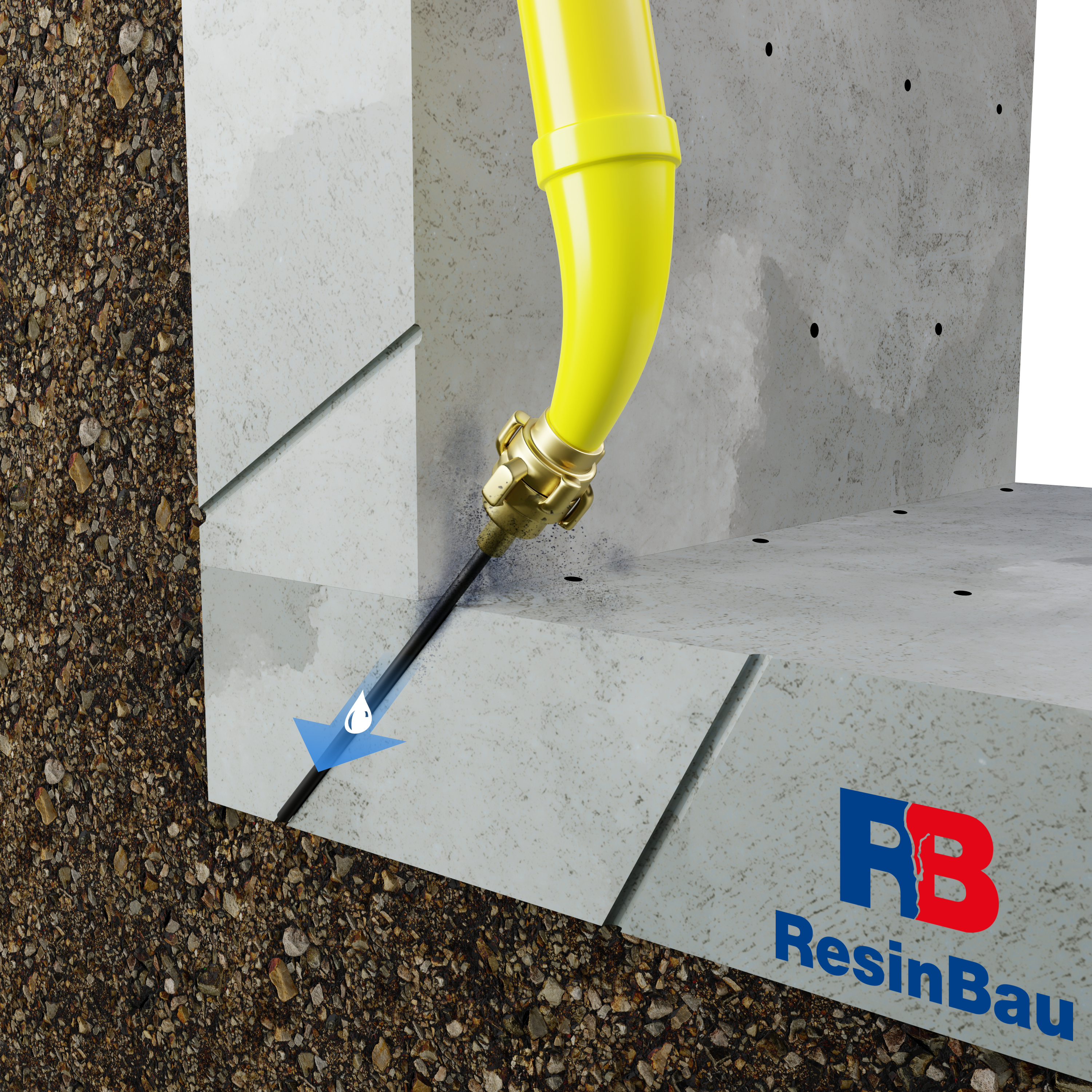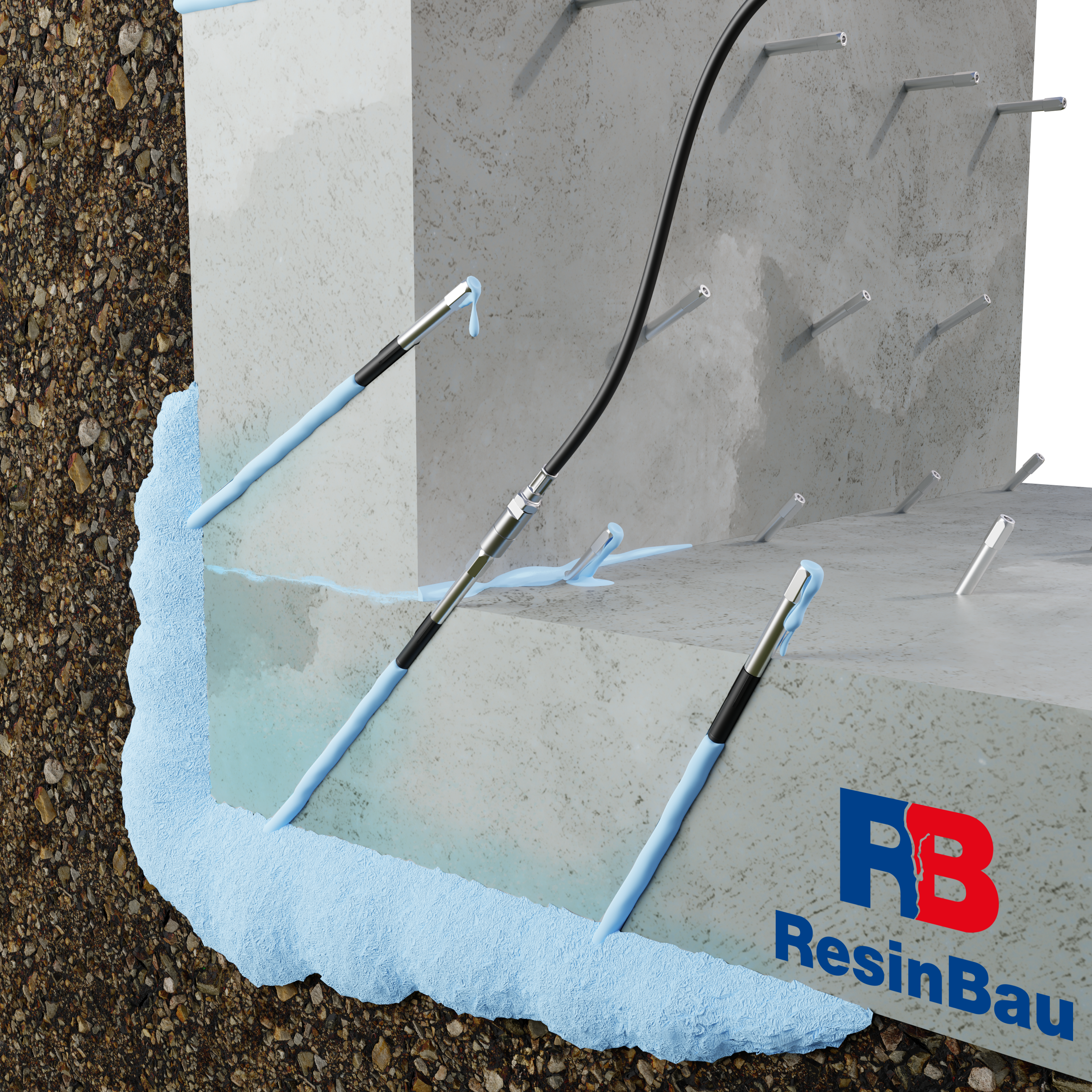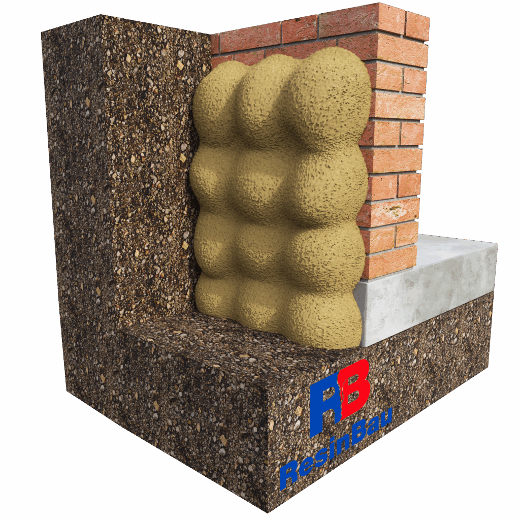 Iniekcja kurtynowa (kurtyna uszczelniająca) – Metoda polegająca na wytworzeniu elastycznej bariery przeciwwodnej po zewnętrznej stronie konstrukcji, najczęściej za ścianą fundamentową lub w szczelinie konstrukcyjnej. Stosuje się głównie AcrylGel lub HydroGum, które dzięki niskiej lepkości i zdolności penetracji skutecznie wypełniają pustki i porowatość podłoża. W przypadku intensywnych przecieków lub obecności dużych pustek możliwe jest wstępne zatrzymanie wody lub wykonanie warstwy ograniczającej wypływ materiału za pomocą żywicy WaterStopper – pozwala to zmniejszyć zużycie żelu i uzyskać bardziej ekonomiczne wypełnienie. AcrylGel może być stosowany z wodą (zamiast polimeru), co dodatkowo obniża koszt wykonania kurtyny przy zachowaniu skutecznych właściwości uszczelniających. Ilość materiału dobiera się indywidualnie – orientacyjne zużycie wynosi ok. 10–25 kg/m² powierzchni kurtyny.